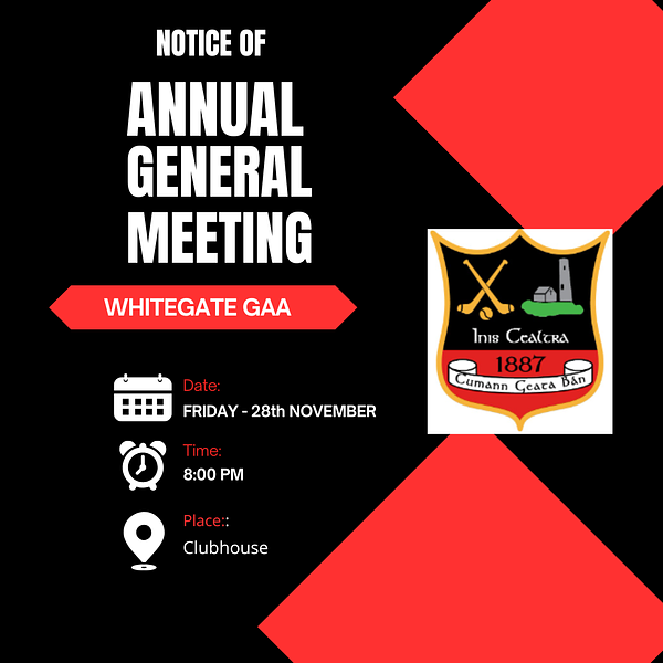Whitegate GAA will be holding its AGM for 2025 on Friday 28th November at 8pm in the clubhouse.
