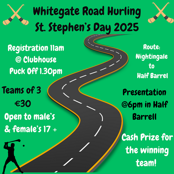 We are delighted to introduce our 1st roadhurling event! A fantastic opportunity to walk of the Christmas Turkey, brush up on your hurling skills & enjoy this unique event with your team! Open to anyone 17 and older.